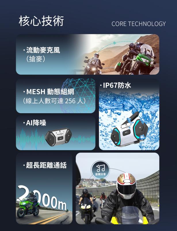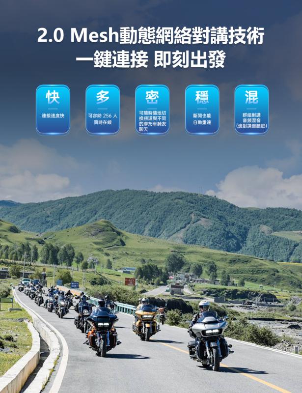 專為多場景應用打造的高性能藍牙對講耳機,結合 MESH 動態網狀通訊技術與優異的訊號穿透能力,支援最多 256 人互聯,通訊距離可達 1.5–2 公里,無論摩托車團騎、登山健行、滑雪、自行車運動或大型戶外活動,即使跨牆依舊保持穩定連線,為團隊協作與娛樂帶來流暢體驗。