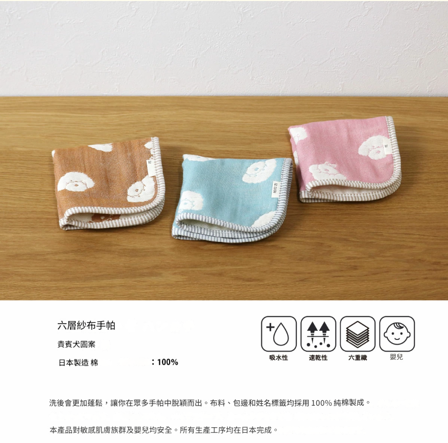 這款貴賓狗造型的手帕以純淨的棉紗精心編織而成,厚實的六層設計不僅增強了其吸濕性,還能迅速乾燥,讓您不再擔心潮濕的手帕帶來的不適感。