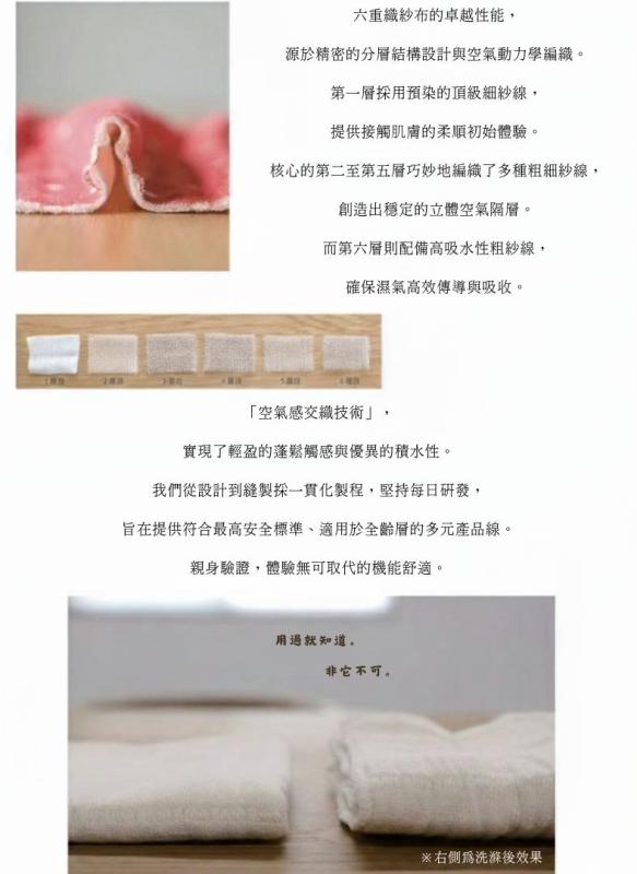 使用 100% 純棉六層紗布,輕盈蓬鬆、吸水力強。