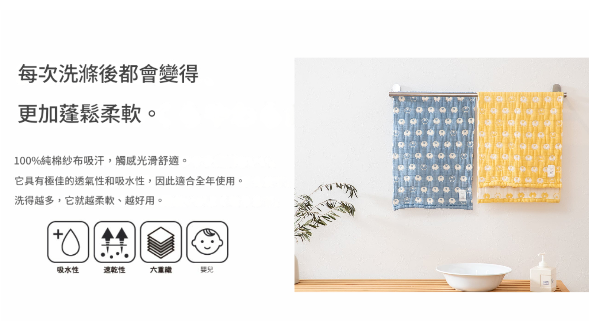 它採用六層純棉紗布的精緻交織技術,確保了極高的吸水力與透氣性,讓您每次使用後,都能感受到乾爽與愉悅。
