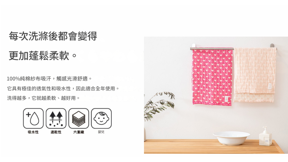 這款【日本fuwara六重紗毛巾】粉色愛心毛巾,將為您的日常生活增添無限的優雅與舒適。