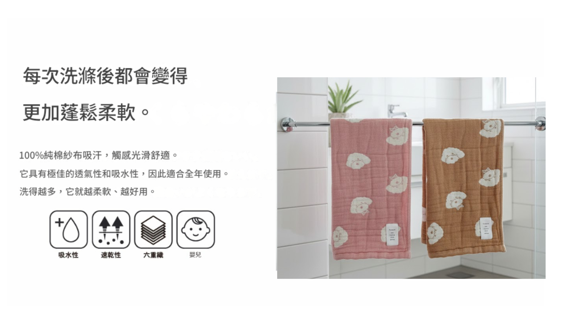 它採用六層純棉紗布的精緻交織技術,確保了極高的吸水力與透氣性,讓您每次使用後,都能感受到乾爽與愉悅。